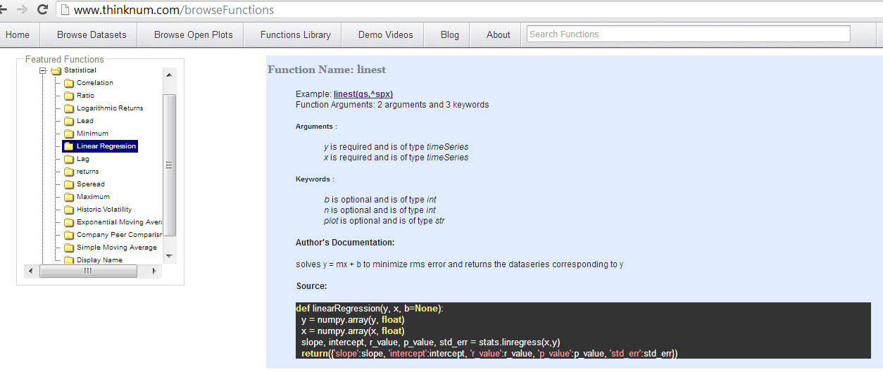 http://www.thinknum.com/    Function Linear Regression Linest gs spx