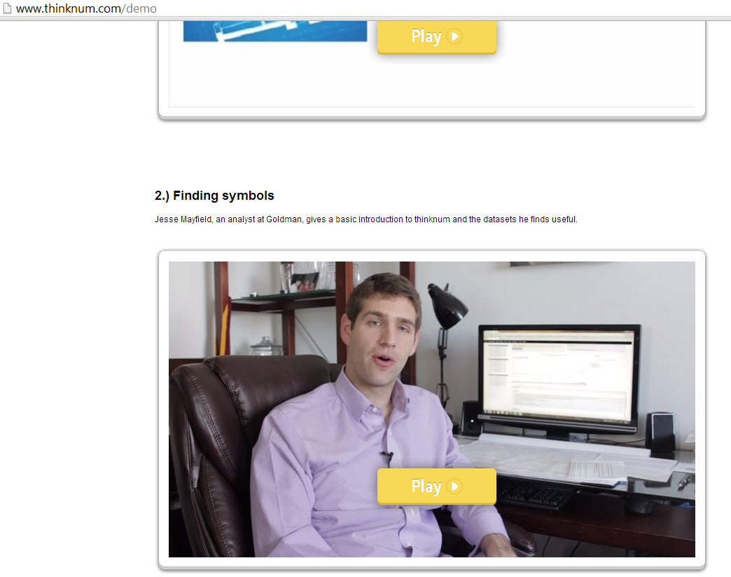 ThinkNum indexes financial data by exposing it to a simple application programming interface (API). It serves as a financial analysis engine that brings information typically found in Wall Street to an open platform. The engine connects to over two hundred data sources, and can be analyzed in a library with over a thousand data analysis algorithms. It provides users with curve trade and regression functions, among other algorithms from academia and quant trading. The company currently offers two applications for investment decisions: ThinkNum Plotter and ThinkNum Cashflow Engine. ThinkNum Plotter manipulates time series data using mathematical expressions and analyzes data without writing code. ThinkNum Cashflow Engine views discounted cash flow models online. All assumptions in the model can be changed by the user. Read more at : http://nj-connect.com/2013/09/30/financial-data-indexer-speaks-at-princeton-tech-meet-up/